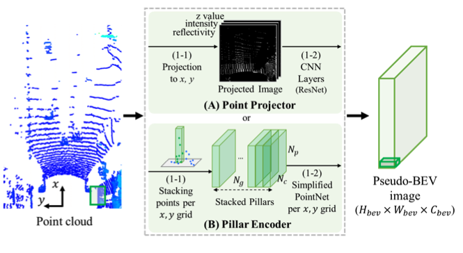 point projector projects point clouds into the xy-horizontal plane and produces a BEV feature map using CNN. In this case, three additional information (z, intensity, and reflectivity) other than x and y of the point cloud is used to generate three channels of the produced pseudo-BEV image.