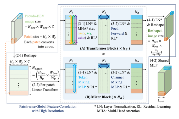 2. BEV 패치 임베딩: BEV 특징 맵을 고정 크기의 패치들로 나누고, 각 패치를 벡터 형태로 변환(임베딩).