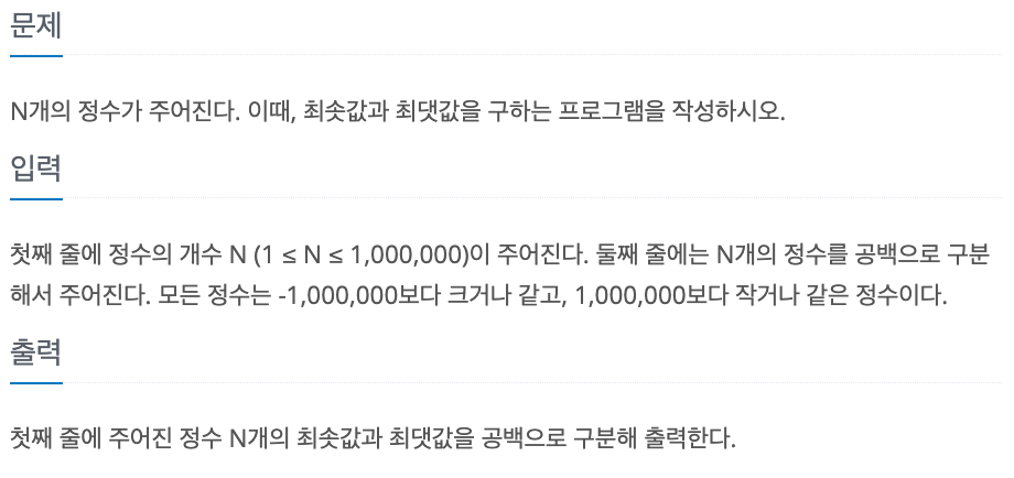 처음에 시간 초과 에러가 나온 코드를 먼저 보여드리겠습니다. 너무 간단하게 생각해서 그냥 리스트에 다 때려 박고 min, max를 출력하면 되는 줄 알았습니다.