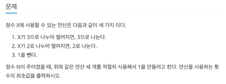 # 3으로 나눠지면 1을 뺀수의 연산횟수에 1회를 더해준 수와 3으로 나눈 수의 연산횟수에 1을 더해준 수중 작은것을 고른다.