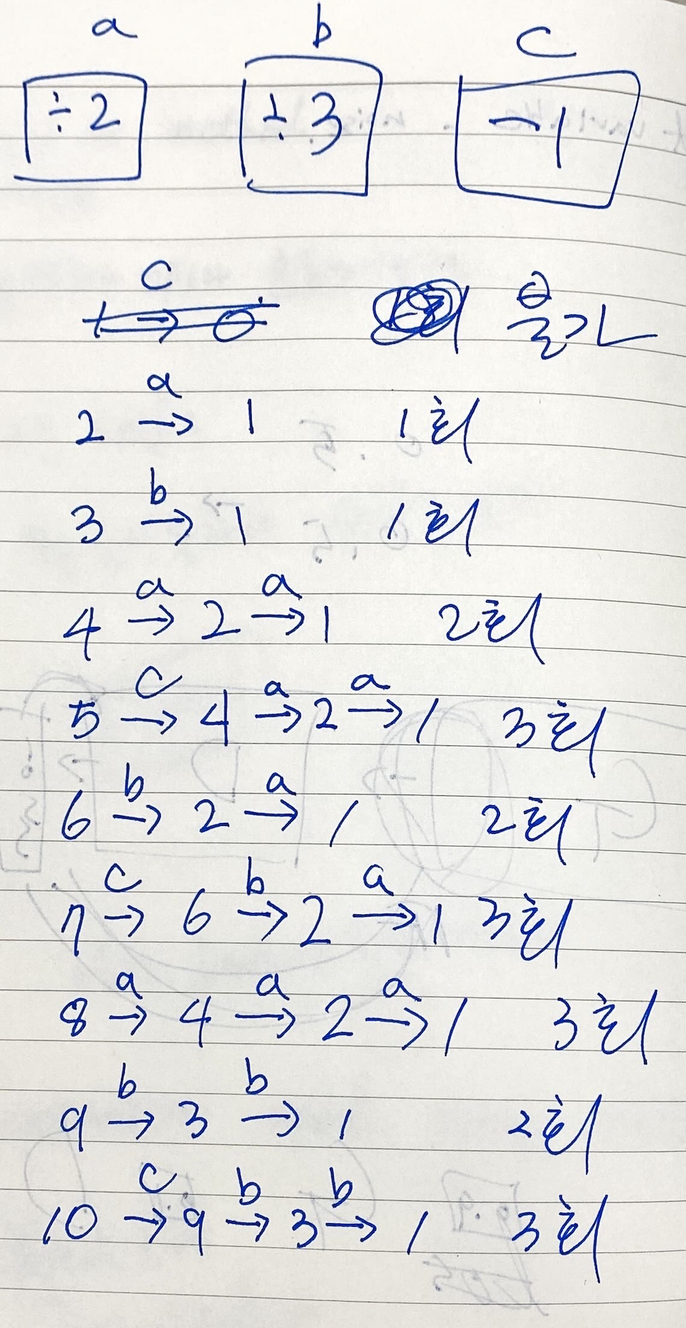 #2 or 3 으로도 나눠지지 않는 경우가 있기 때문에 냅다 그전 횟수에 1을 더해줍니다. 즉, -1 연산으로만 접근할수 있을때!